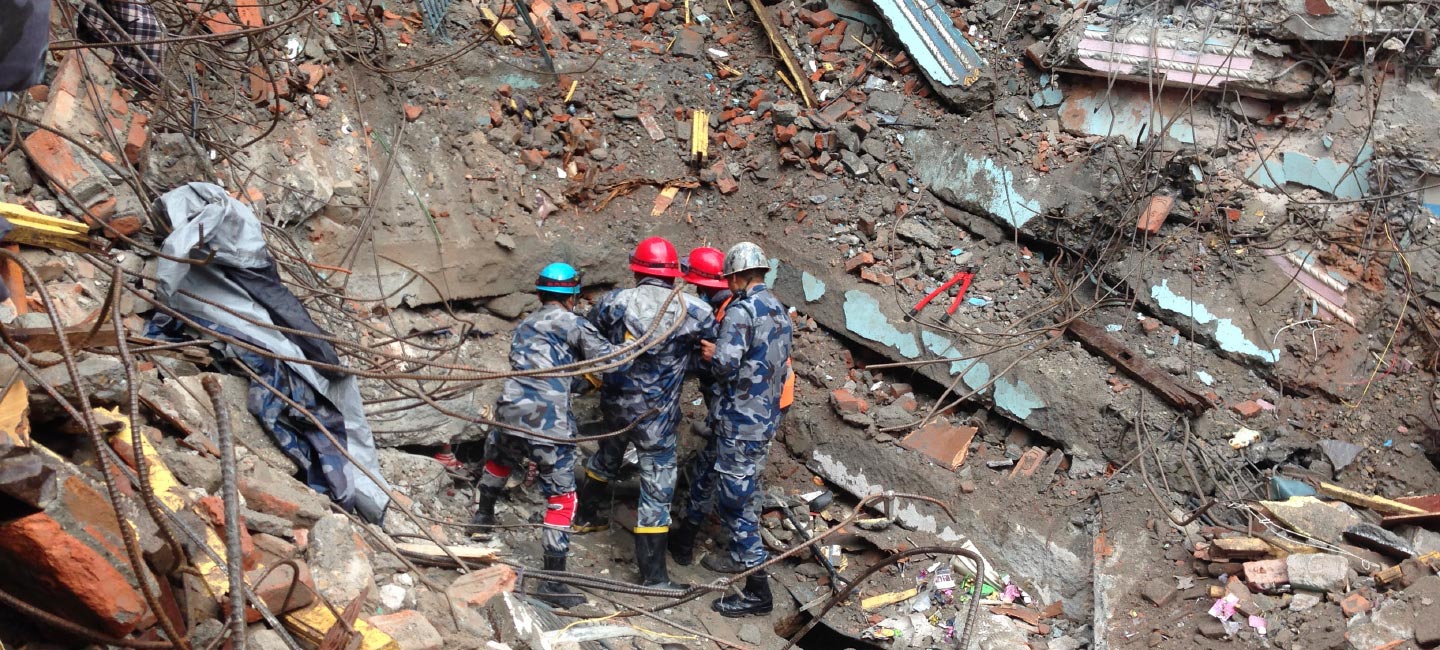 Off to the side, four Nepalese police were standing in a deep pit, straining to look into a narrow gap between two concrete slabs. Six days earlier, these concrete slabs had been the floors and ceilings of a seven-story office building.
